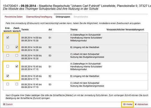 Sie können darüber hinaus optional jeweils für einen Anmeldeblock einen Erstwunsch und n Zweitwünsche markieren, damit Sie im Falle einer eventuellen Überbuchung oder des Ausfalls einer Untergruppe einer anderen Untergruppenveranstaltung zugeordnet werden können.