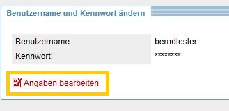 gelangen Sie in den Anzeigebereich für Ihren Benutzernamen und das zugehörige Kennwort. Aus Sicherheitsgründen wird das Kennwort dabei nicht im Klartext angezeigt. Über den Link ANGABEN BEARBEITEN können Sie Ihren Benutzernamen und Ihr Kennwort anpassen.