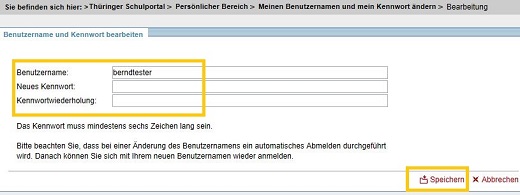Nach Ihrem Antrag auf persönliche Zugangsdaten für das Thüringer Schulportal haben Sie einen Benutzernamen und ein zugehöriges Kennwort erhalten. Über den Link MEINEN BENUTZERNAMEN UND MEIN KENNWORT ÄNDERN in der Box "Persönliche Angaben"