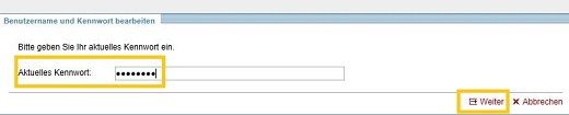 Für die aktuelle Bearbeitung des Benutzernamens und/oder des Kennworts muss in einem ersten Bearbeitungsschritt das aktuell gültige Kennwort eingegeben werden. Betätigen Sie anschließend den Link WEITER.