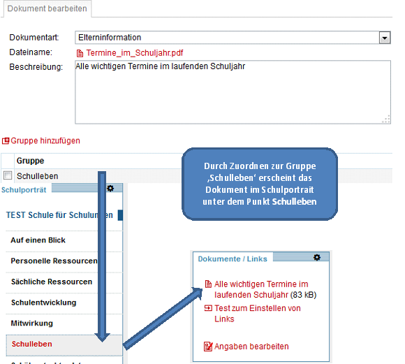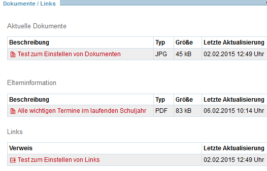 In der Ansicht "Dokumente/ Links" des Schulporträts werden die Angaben nach Rubriken sortiert. Die Dokumentart dient dieser Zuordnung.