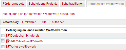 In dieser Kategorie kann eine Liste aller landesweiten Wettbewerbe erzeugt werden, an denen eine Schule teilnimmt. Die Auswahl der Wettbewerbe erfolgt aus einem vorgegebenen Drop-Down-Menü. Es können beliebig viele Wettbewerbe hinzugefügt werden.