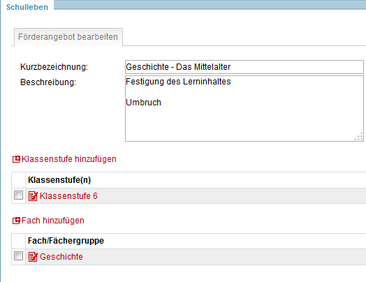 Entfernen wird die Zuordnung zu den Klassenstufen bzw. Fächern entfernt.Achtung: Das Löschen wird an dieser Stelle sofort wirksam. Vorhandene Einträge können durch eine erneute Auswahl oder direktes