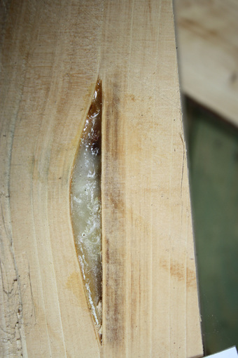 Das Foto gehört zur Serie "Nadelbäume". Es zeigt eine Blase mit Baumharz im Fichtenholz. Es gelten die Nutzungsbedingungen der Mediothek und Pixiothek.