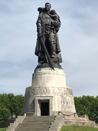 Das Sowjetische Ehrenmal ist eine Gedenkstätte und ein Soldatenfriedhof im Treptower Park in Berlin. Die im Mai 1949 fertiggestellte Anlage wurde auf Weisung der Sowjetischen Militäradministration in Deutschland errichtet, um die im Zweiten Weltkrieg gefallenen Soldaten der Roten Armee zu ehren. Es wurden ca. 7000 der in der Schlacht um Berlin gefallenen Soldaten hier bestattet. Ein breit angelegter, leicht ansteigender und von „trauernden“ Birken gesäumter Weg führt zum Hauptfeld der Gedenkstätte. Der Weg ist markiert durch zwei große, stilisierte Fahnen. An ihrer Stirnseite befindet sich jeweils die Skulptur eines knienden Soldaten in voller Montur und mit einer Maschinenpistole bewaffnet. Sechzehn weiße Sarkophage stehen entlang der äußeren Begrenzung. Sie sind auf den beiden Längsseiten mit Reliefs aus der Geschichte des Großen Vaterländischen Krieges der Sowjetvölker versehen und tragen auf der dem zentralen Feld zugewandten Schmalseite Zitate von Josef Stalin. Der zentrale Ort der Anlage wird durch eine auf einem Sockel stehende Skulptur „Der Befreier“ von Jewgeni Wutschetitsch gebildet. Die Figur stellt einen Soldaten dar, der in der rechten Hand ein Schwert und auf dem linken Arm schützend ein Kind trägt; ein Hakenkreuz zerbricht unter seinen Stiefeln. Die Skulptur ist 12 Meter hoch und 70 Tonnen schwer.