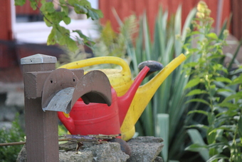 Das Bild zeigt Gießkannen im Garten. Das Bild ist unter CC0 lizenziert und kann somit frei verwendet werden.