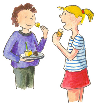 Das Bild zeigt gezeichnete Kinder mit Snack vom Büfett. Es gelten die Nutzungsbedingungen der Mediothek und Pixiothek.