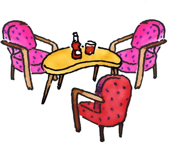 Das Bild gehört zur Serie "Hauswirtschaft". Es zeigt eine gezeichnete Sitzecke mit Postersesseln und Couchtisch. Es gelten die Nutzungsbedingungen der Mediothek und Pixiothek.