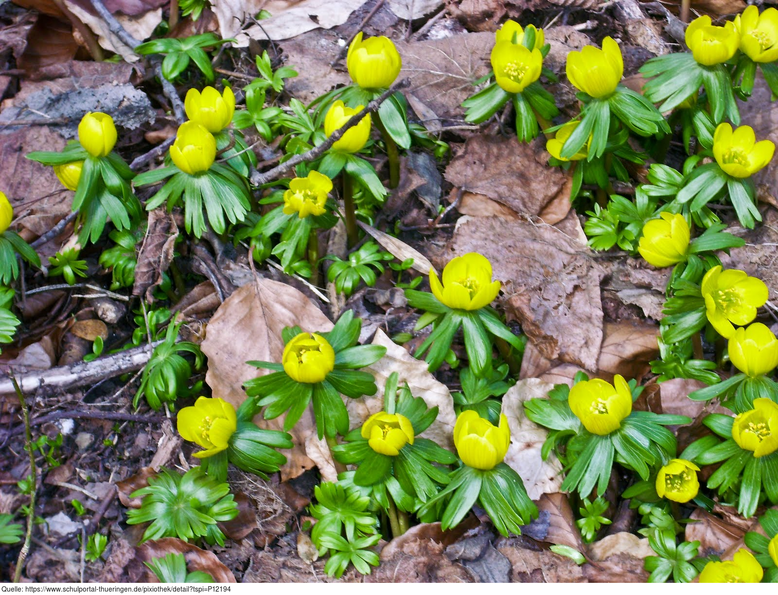 Das Foto gehört zur Serie "Frühblüher". Es zeigt Blüten vom Winterling (Eranthis hyemalis). Die Pflanzengattung Winterlinge gehört zur Familie der Hahnenfußgewächse (Ranunculaceae). Die Blütezeit reicht im Vorfrühling von Februar bis März. Es gelten die Nutzungsbedingungen der Mediothek und Pixiothek.