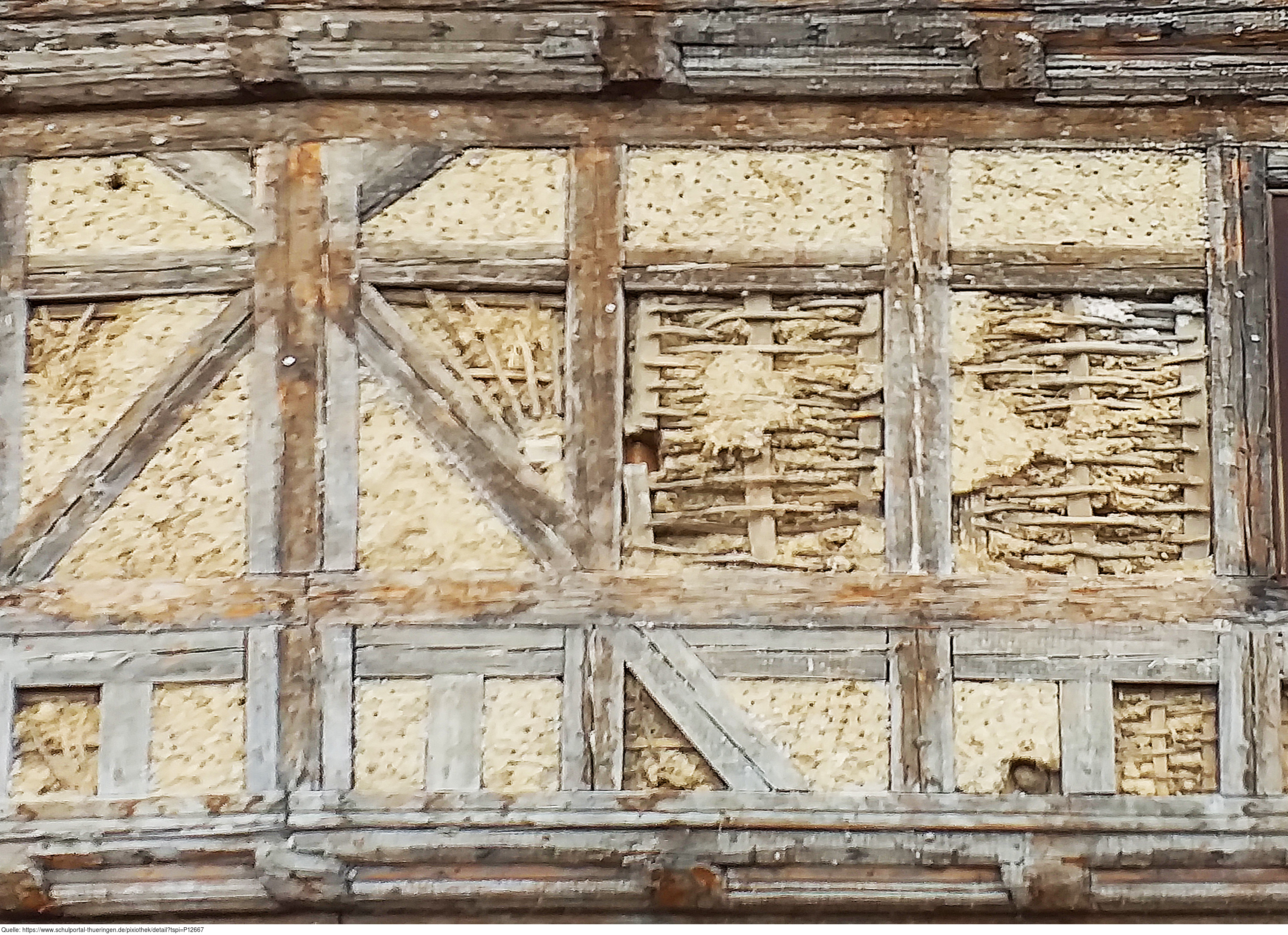 Das Foto gehört zur Serie "Fachwerkhäuser". Es zeigt Gefache mit Astgeflecht und Lehmausfachung eines sanierungswürdigen Fachwerkhauses. Es gelten die Nutzungsbedingungen der Mediothek und Pixiothek.