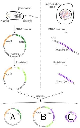 Schematischer Ablauf einer Bakterien-Klonierung mittels zweier Resistenzen (ampR, tetR).