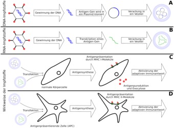 Erzeugung und WIrkung von Impfstoffen auf Erbgut-Basis (DNA und RNA). Es gelten die Nutzungsbedingungen der Mediothek und Pixiothek. Auf http://unterricht.petzinger.net/biochdropbox.html auch als svg und in CC-BY verfügbar.