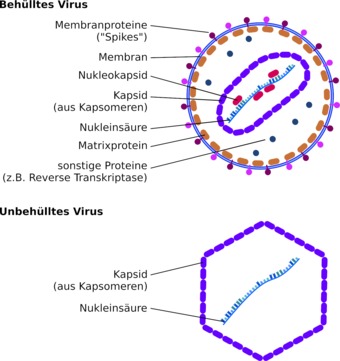 Aufbau behüllter und unbehüllter Viren. Es gelten die Nutzungsbedingungen der Mediothek und Pixiothek. Auf http://unterricht.petzinger.net/biochdropbox.html auch als svg und in CC-BY verfügbar.