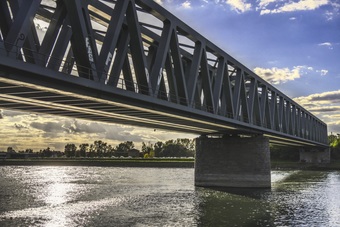Das Bild zeigt eine Rheinbrücke bei Karlsruhe. Das Bild ist unter CC0 lizenziert und kann somit frei verwendet werden.