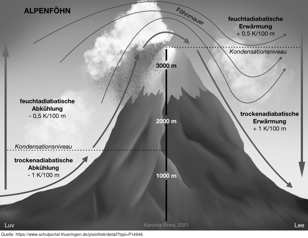 Das Bild gehört zur Serie "Grafische Darstellung Alpenföhn". Das Bild verdeutlicht den Alpenföhn (Föhnwind des Alpenraumes). Bild-Variante: Berg mit Wolken und Niederschlag; s/w; beschriftet. Es gelten die Nutzungsbedingungen der Mediothek und Pixiothek.