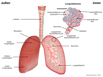 Das Bild gehört zur Serie "Organe des Menschen". Das Bild verdeutlicht den Aufbau der menschlichen Lunge. Bild-Variante: Lunge mit Luftkreislauf; farbig; beschriftet. Es gelten die Nutzungsbedingungen der Mediothek und Pixiothek.