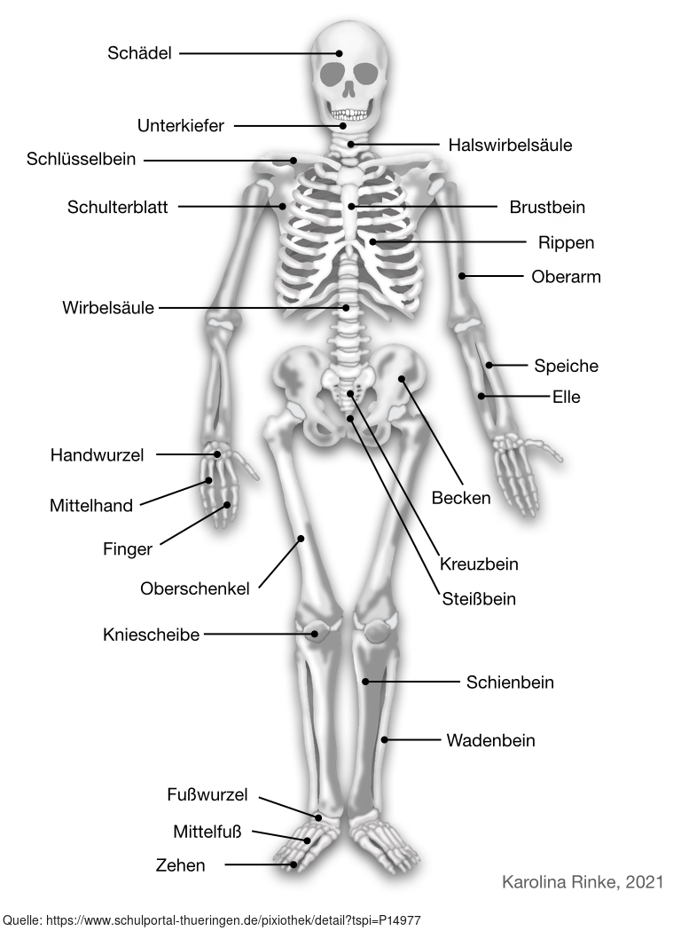 Das Bild zeigt den Aufbau vom menschlichen Skelett. Bild-Variante: Skelett; s/w; beschriftet. Es gelten die Nutzungsbedingungen der Mediothek und Pixiothek.
