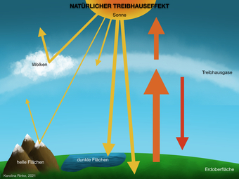 Das Bild verdeutlicht den natürlichen Treibhauseffekt. Bild-Variante: farbig; teilbeschriftet. Es gelten die Nutzungsbedingungen der Mediothek und Pixiothek.
