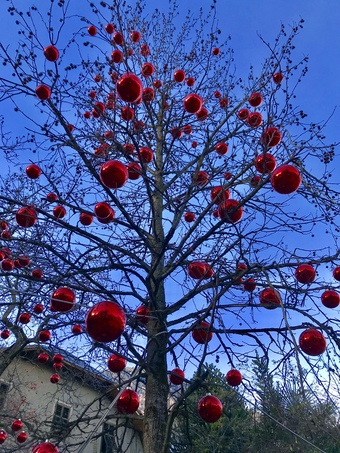Weihnachtliche Dekoration mit Kugeln an einem Baum. Es gelten die Nutzungsbedingungen der Mediothek und Pixiothek.