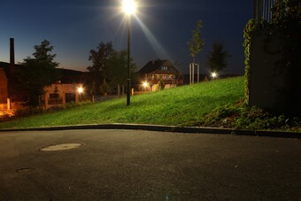 Motiv eines Stadtrundganges durch Pößneck (Ostthüringen) bei Nacht. Abgebildet ist das sogenannte Schweizer Haus, ein 1895/96 in alpenländischem Stil errichtete Stadthaus des Textilfabrikanten Bernhard Siegel. Es gelten die Nutzungsbedingungen der Mediothek und Pixiothek.