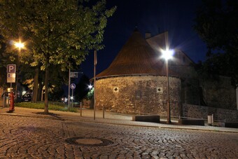 Motiv eines Stadtrundganges durch Pößneck (Ostthüringen) bei Nacht. Abgebildet ist der Pulverturm. Es gelten die Nutzungsbedingungen der Mediothek und Pixiothek.