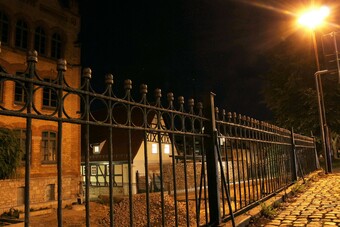 Motiv eines Stadtrundganges durch Pößneck (Ostthüringen) bei Nacht. Abgebildet ist der Blick durch die Umzäunung des Gymnasiums Am Weißen Turm auf das Museum 642, Pößnecker Museum für Stadtgeschichte.. Es gelten die Nutzungsbedingungen der Mediothek und Pixiothek.