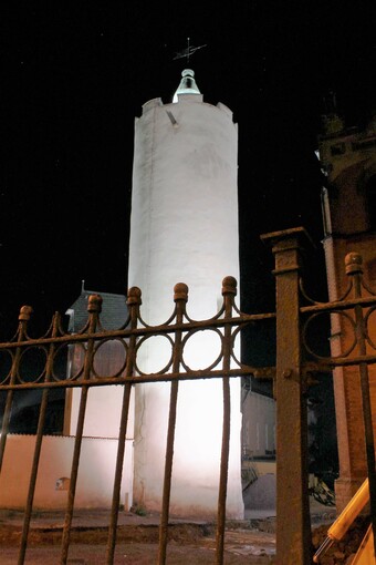 Motiv eines Stadtrundganges durch Pößneck (Ostthüringen) bei Nacht. Abgebildet ist der Weiße Turm, eines der Wahrzeichen der Stadt. Es gelten die Nutzungsbedingungen der Mediothek und Pixiothek.