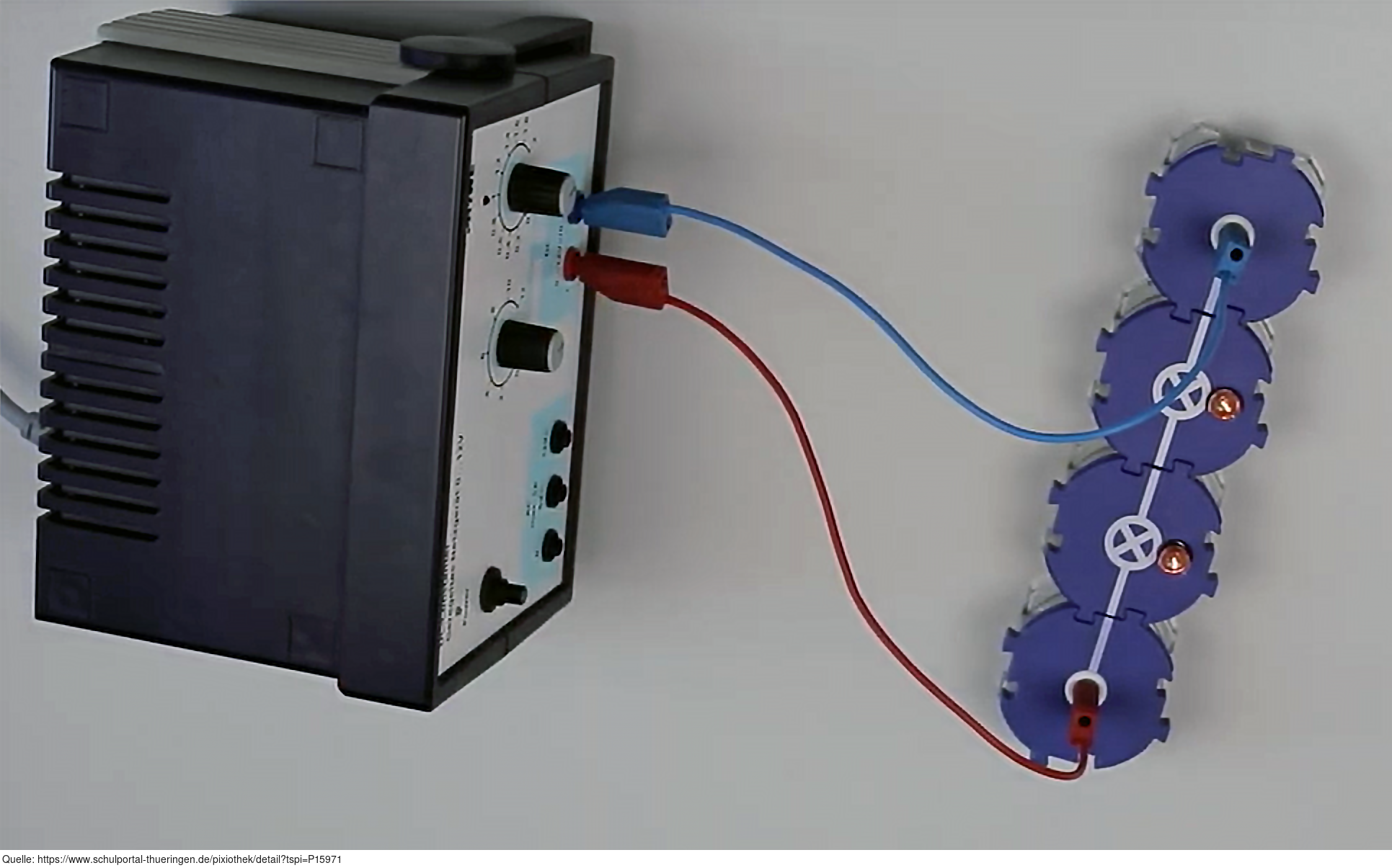 Das Bild gehört zur Serie "Elektrische Schaltungen". Es zeigt den Aufbau einer Reihenschaltung mit Spannungsquelle, Schalter und zwei Verbrauchern (Glühlampe). Der teilweise bearbeitete Screenshot stammt aus einem Video von Ecole Science, welches ebenfalls hier in der Pixiothek abrufbar ist (siehe Auswahl verwandter Medien). Das Bild ist unter CC0 lizenziert und kann somit frei verwendet werden.