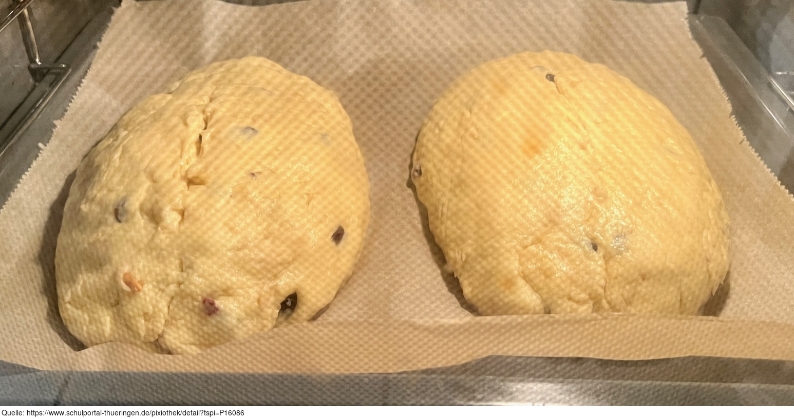 Weihnachtsstollen, frische Teiglinge im Ofen