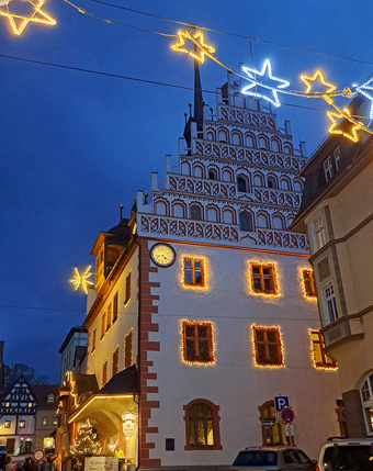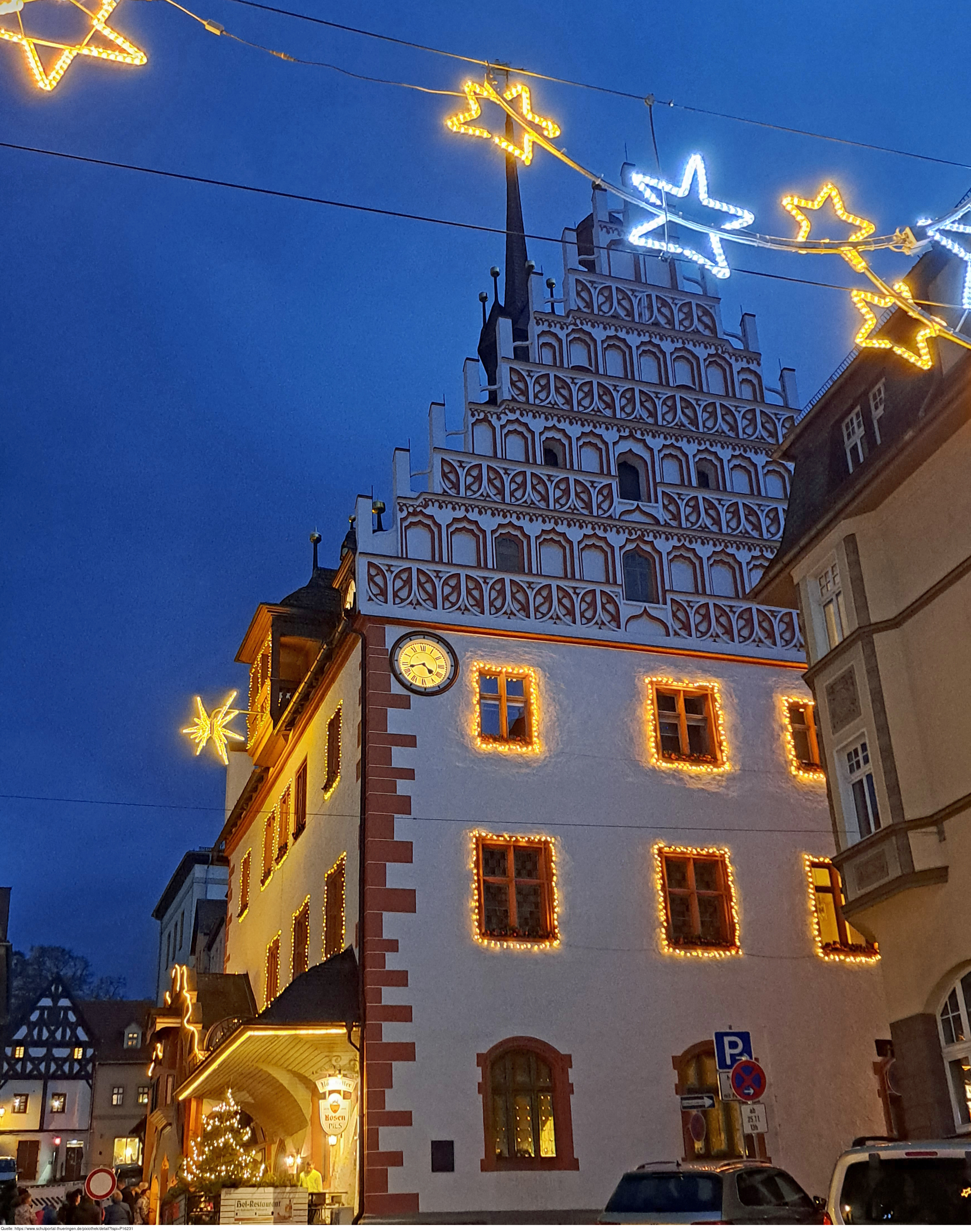 Das Foto gehört zur Serie "Weihnacht". Es zeigt die Weihnachtsdekoration am Rathaus von Pößneck. Es gelten die Nutzungsbedingungen der Mediothek und Pixiothek.