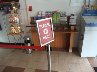 "Please queue here", abgekürzt. In einer Bank in Singapur. Das Bild ist eine mögliche Illustration des Informatik-Begriffs Warteschlange. Es gelten die Nutzungsbedingungen der Mediothek und Pixiothek.