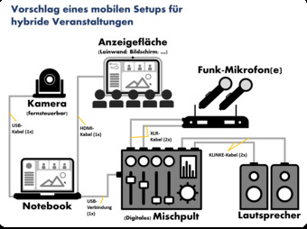 Das Bild zeigt eine symbolische Darstellung eines möglichen mobilen Setups für hybride Veranstaltungen. Die Bestandteile der Abbildung liegen in der Serie „Mobiles Setup für hybride Veranstaltungen“ nochmals als gesonderte Grafiken vor. Es gelten die Nutzungsbedingungen der Mediothek und Pixiothek.