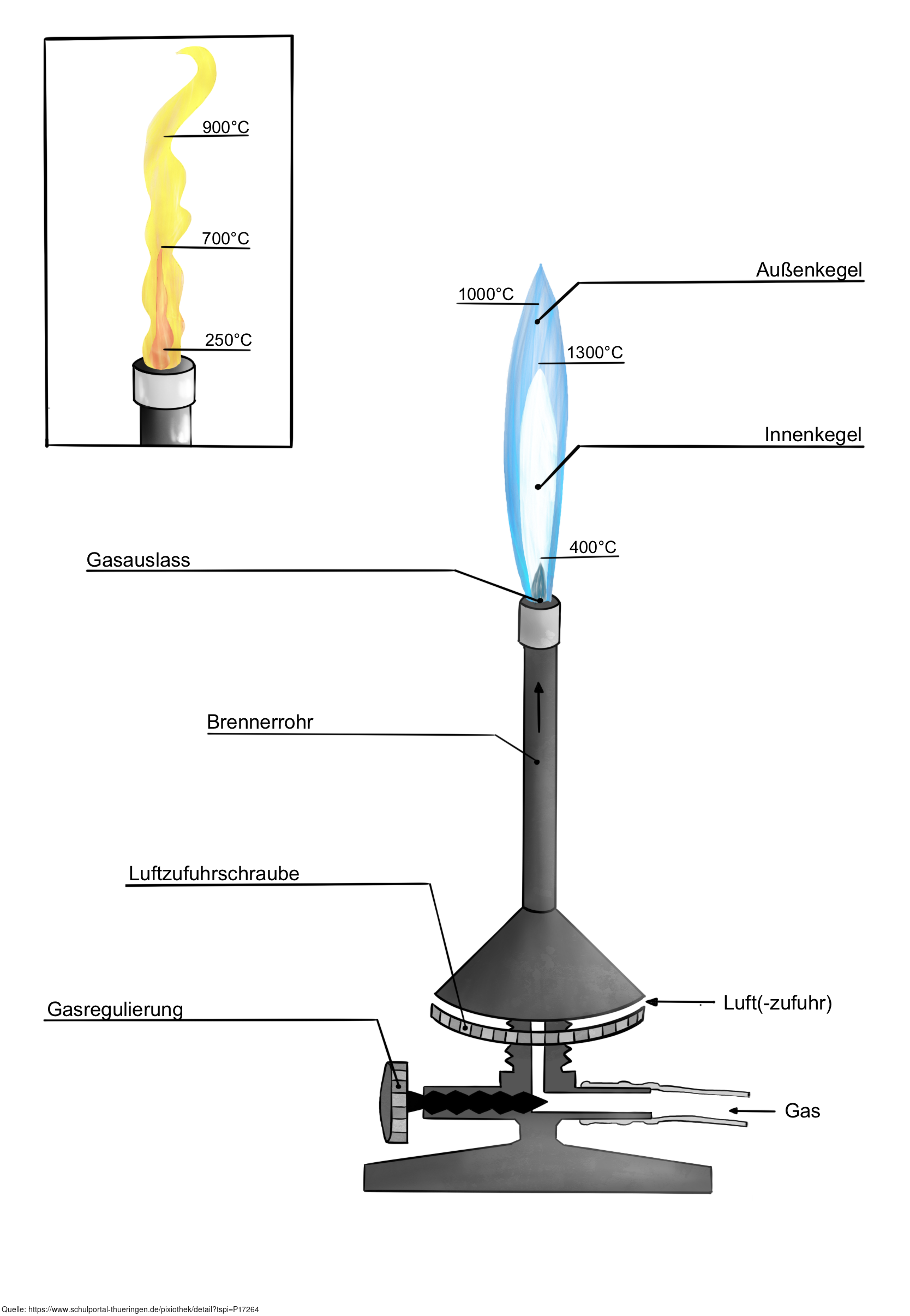 Das Bild verdeutlicht den Aufbau eines Bunsenbrenners. Variante: zwei Flammen, farbig; beschriftet. Es gelten die Nutzungsbedingungen der Mediothek und Pixiothek.