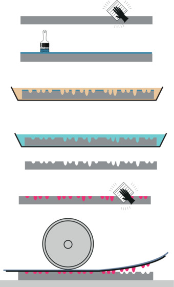 Das Bild gehört zur Serie "Künstlerische Drucktechniken - Tiefdruck - Strichätzung". Es zeigt die Gesamtdarstellung des Vorganges: Die Linien werden in die mit einer Schutzschicht versehene Druckplatte durch eine Radiernadel eingezeichnet. Die Schutzschicht wird verletzt und die Druckplatte an den radierten Stellen wieder freigelegt. Ein Ätzmittel greift an den ungeschützten Stellen der Druckplatte an und ätzt die Linien in die Tiefe. Es gelten die Nutzungsbedingungen der Mediothek und Pixiothek.