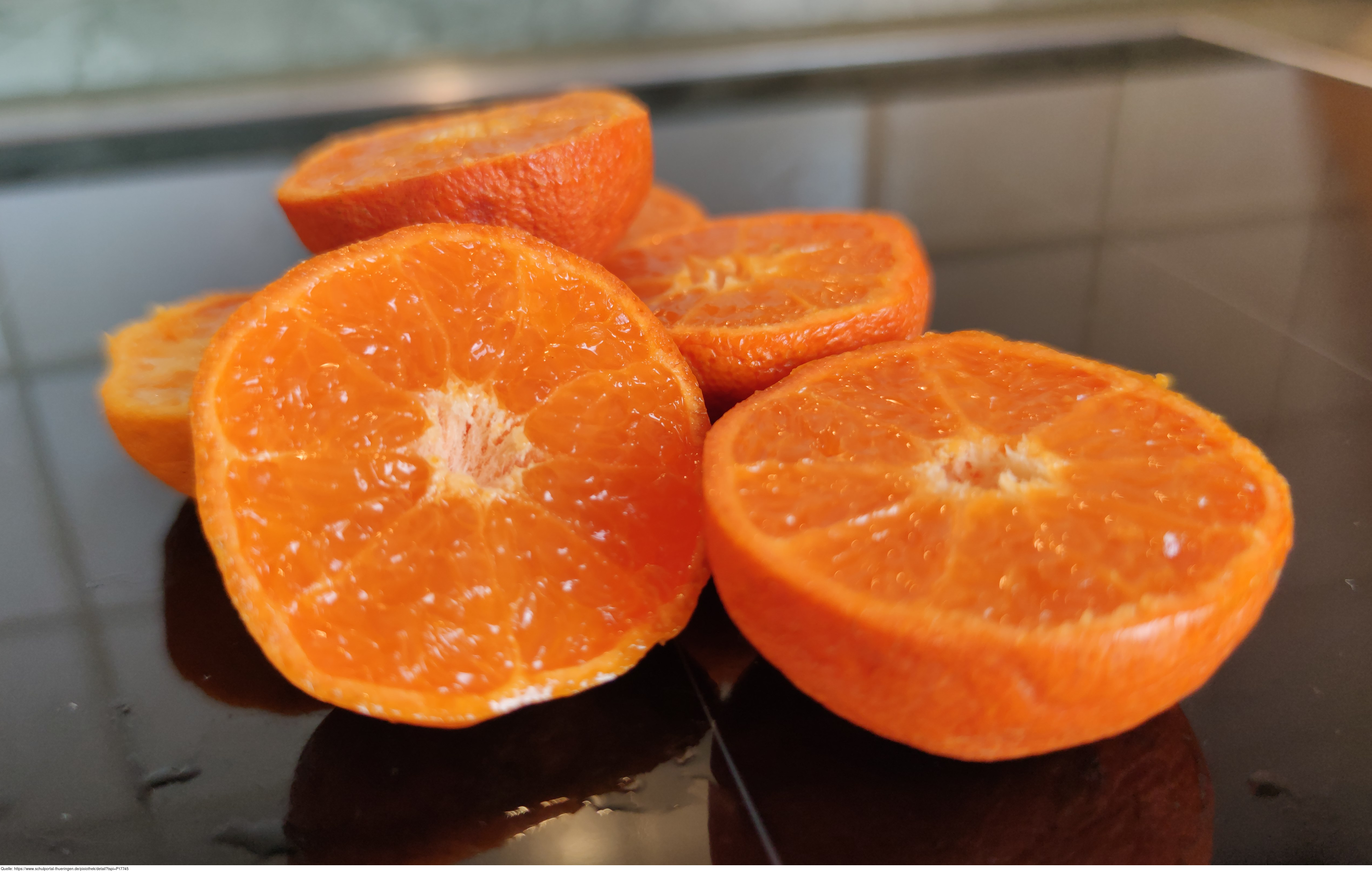 Das Bild gehört zur Serie "Obst". Zu sehen sind aufgeschnittene Mandarinen. Es gelten die Nutzungsbedingungen der Mediothek und Pixiothek.