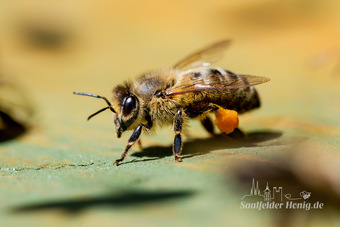 Das Bild gehört zur Serie "Saalfelder Honig", aufgenommen vom Imker Bernd Rümpler, Inhaber von saalfelder-honig.de. Zu sehen ist eine weibliche Honigbiene (Arbeiterin) mit Pollenhöschen.