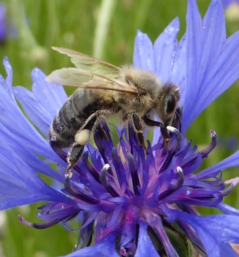 Das Bild gehört zur Serie "Saalfelder Honig", aufgenommen vom Imker Bernd Rümpler, Inhaber von saalfelder-honig.de. Zu sehen ist eine Honigbiene (Flugbiene) auf der Blüte einer Kornblume. Sie klebt Pollen an ihre Hinterbeine, indem sie diesen mit körpereigenen Stoffen vermischt (Pollenhöschen). In ihrem Fell haften sich Pollenkörnchen an, durch welche dann auf der nächsten Blüte deren Befruchtung erfolgt. Mit dem Rüssel nimmt sie am Blütengrund Nektar auf und transportiert diesem im Honigmagen zum Bienenstock.