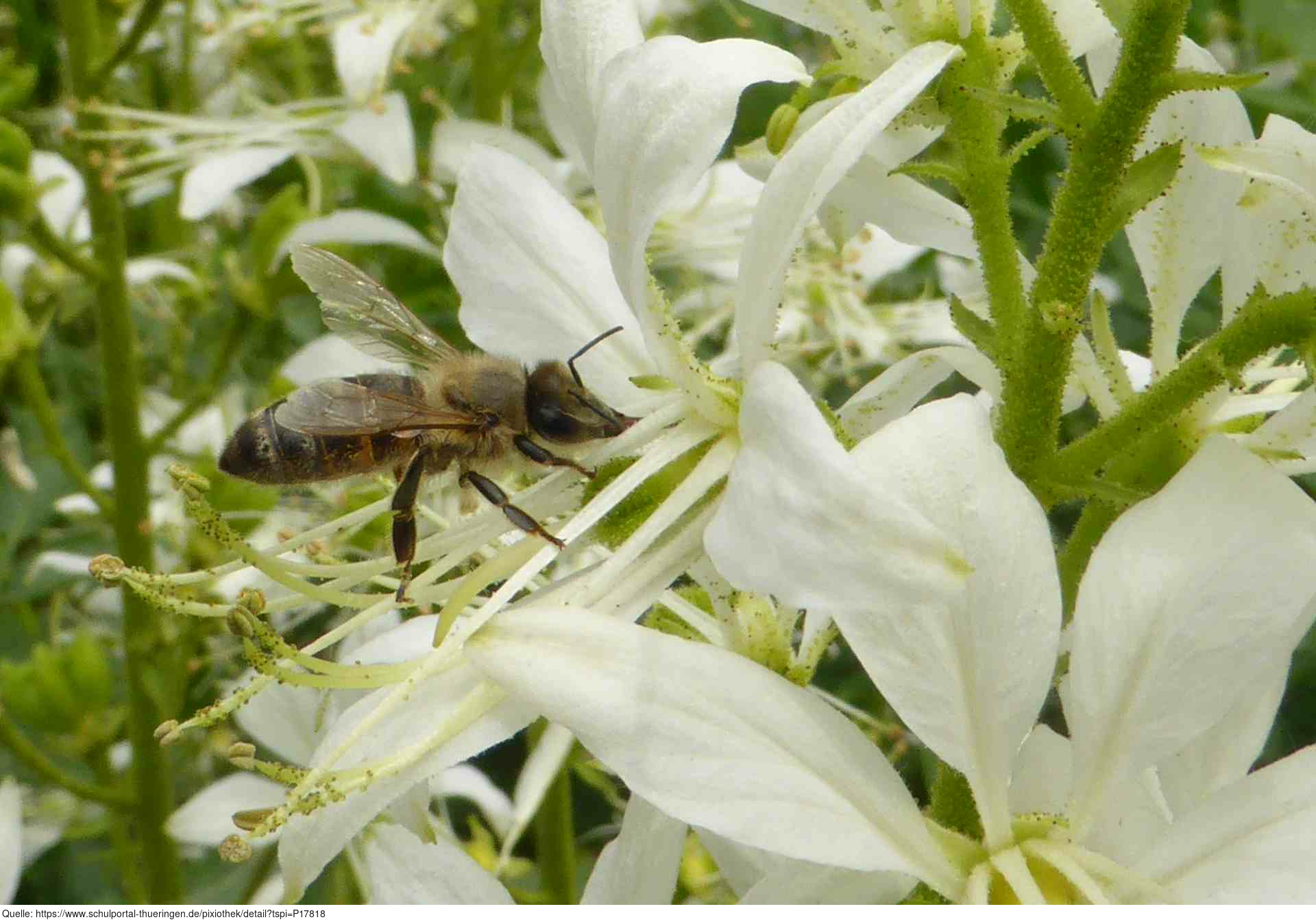 Das Bild gehört zur Serie "Saalfelder Honig", aufgenommen vom Imker Bernd Rümpler, Inhaber von saalfelder-honig.de. Zu sehen ist eine Honigbiene (Flugbiene) beim Sammeln auf einer Diptamblüte. Mit dem Rüssel nimmt sie am Blütengrund Nektar auf und transportiert diesem im Honigmagen zum Bienenstock.