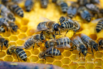 Das Bild gehört zur Serie "Saalfelder Honig", aufgenommen vom Imker Bernd Rümpler, Inhaber von saalfelder-honig.de. Zu sehen sind Arbeiterbienen -Stockbienen - bei der Brutpflege. Zentral im Bild befindet sich eine Weiselzelle oder Nachschaffenszelle einer Königin. Es gelten die Nutzungsbedingungen der Mediothek und Pixiothek.