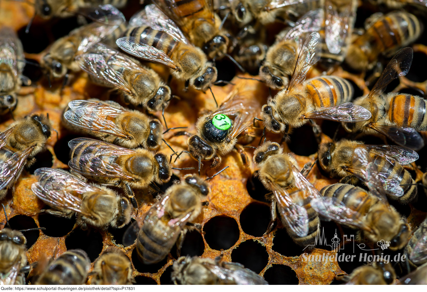 Das Bild gehört zur Serie "Saalfelder Honig", aufgenommen vom Imker Bernd Rümpler, Inhaber von saalfelder-honig.de. Zu sehen ist eine Bienenkönigin (gezeichnet) umringt von Arbeiterinnen (Stockbienen) bei der Eiablage. Dazu schiebt sie ihrem Hinterlieb in die Zelle.