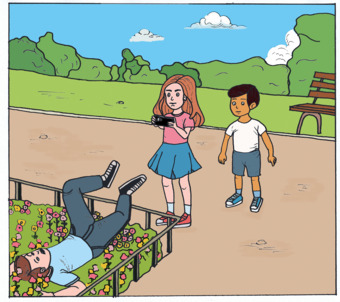Das Bild zeigt einen Vater, der von seiner Tochter mit einem Handy fotografiert wird und währenddessen nach hinten in ein Blumenbeet fällt.. Das Bild kann als Teil einer Bildergeschichte verwendet werden - siehe Funktionslink "Weitere Bilder der Serie". Es gelten die Nutzungsbedingungen der Mediothek und Pixiothek.