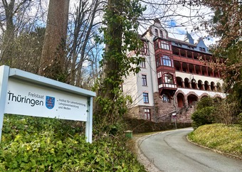 Das Bild zeigt die Auffahrt zum Haupthaus (Haus 1) des ThILLM in Bad Berka. Es gelten die Nutzungsbedingungen der Mediothek und Pixiothek.