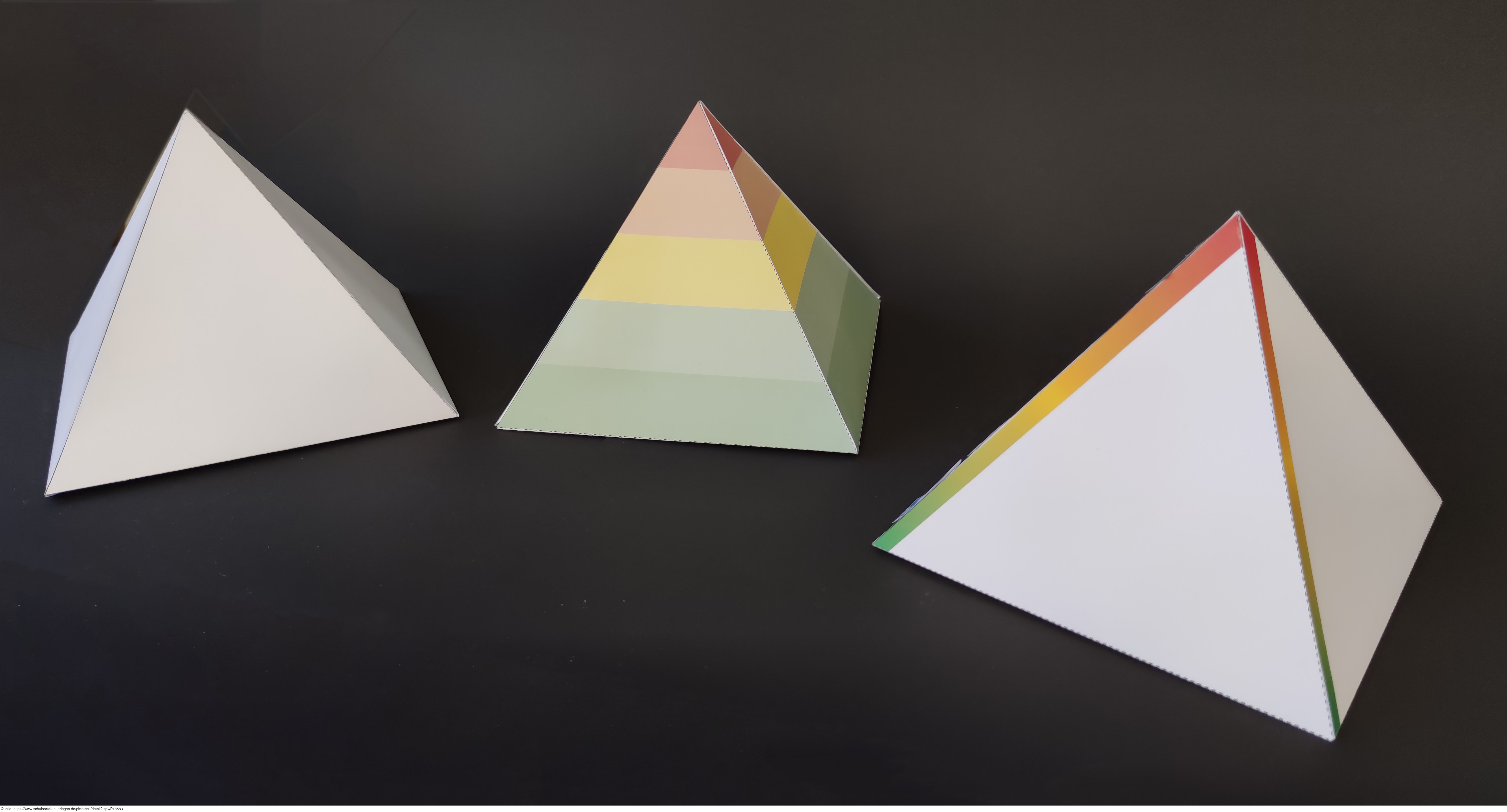 Das Bild zeigt drei Pyramiden aus Papier. Es gehört zur Serie "Ernährungspyramide zum Basteln und Gestalten" und findet u.a. im gleichnamigen Lernobjekt unter https://www.schulportal-thueringen.de/web/guest/media/detail?tspi=18517 Verwendung. Es gelten die Nutzungsbedingungen der Mediothek und Pixiothek.