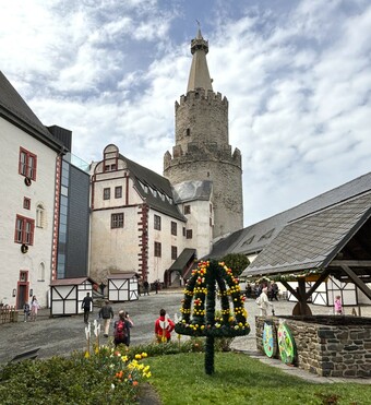 Das Bild entstand auf Osterburg in Weida. Die Burg befindet sich auf einem Berg im Zentrum der Stadt und wurde im 12. Jh. als romanische Befestigungsanlage in strategisch günstiger Lage errichtet. Ihr Name leitet sich vom lateinischen Neuostland ab, den Gebieten Ostthüringens, die auch heute noch als Osterland bezeichnet werden. Die Namensverbindung dient als Anlass, das alljährliche Osterfest hier in besonderer Weise zu feiern.