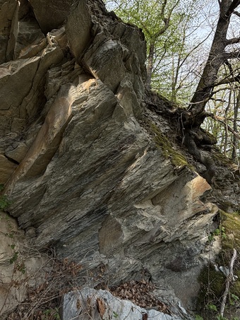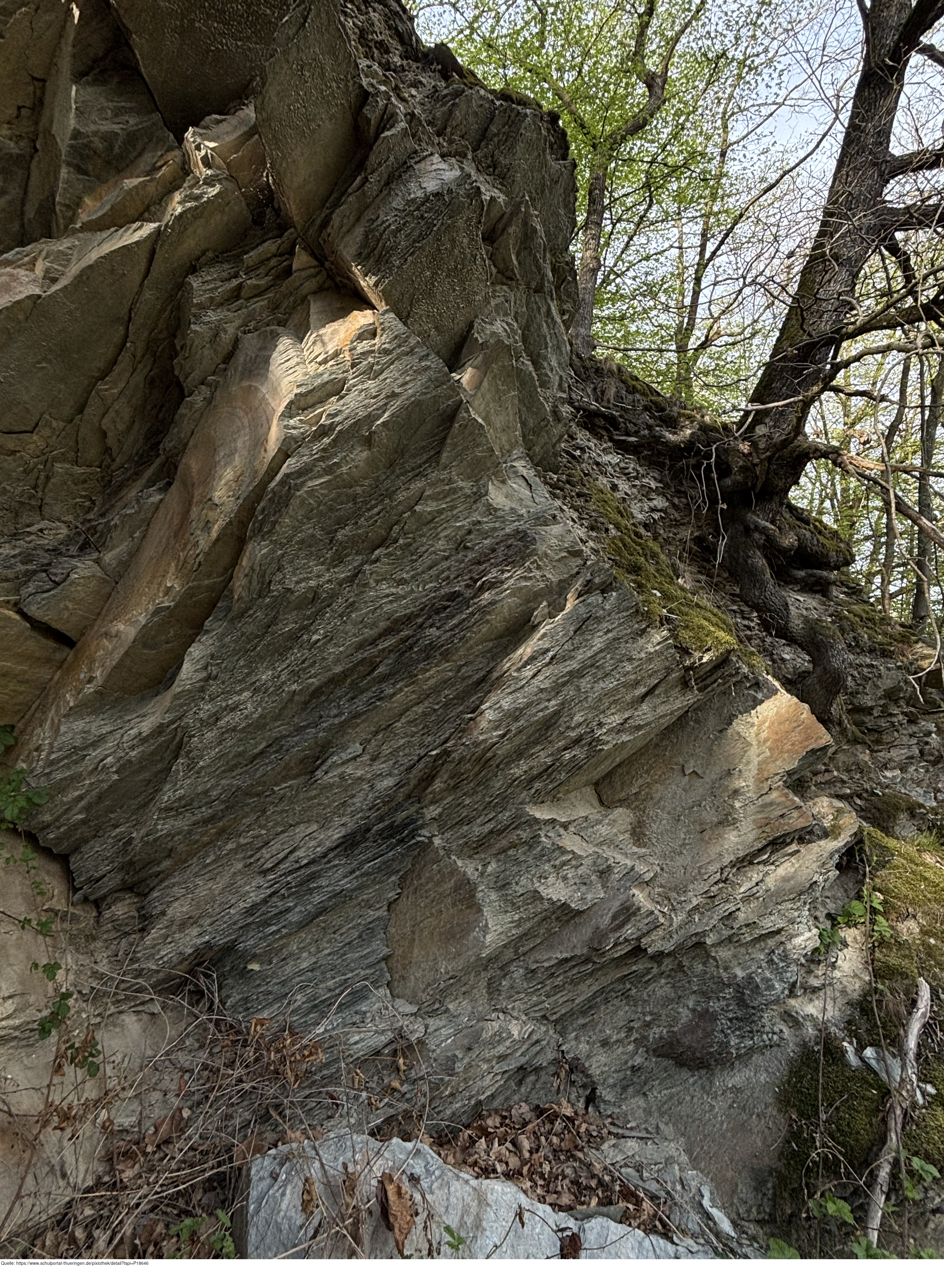 Das Bild zeigt eine metamorphe Wechsellagerung von plattigem Quarzit und Phyllitschiefer am Rande des Zechsteins. Die Fundstelle liegt am Ufer der Weißen Elster in Berga a.d. Weißen Elster.