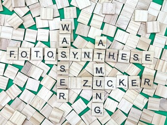 Aus Buchstaben wurden die Begriffe "Fotosysnthese", "Wasser", "Atmung" und "Zucker" gelegt. Es gelten die Nutzungsbedingungen der Mediothek und Pixiothek.