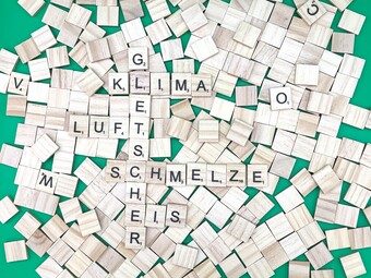 Aus Buchstaben wurden die Begriffe "Gletscher", "Klima", "Luft", "Schmelze" und "Eis" gelegt. Es gelten die Nutzungsbedingungen der Mediothek und Pixiothek.