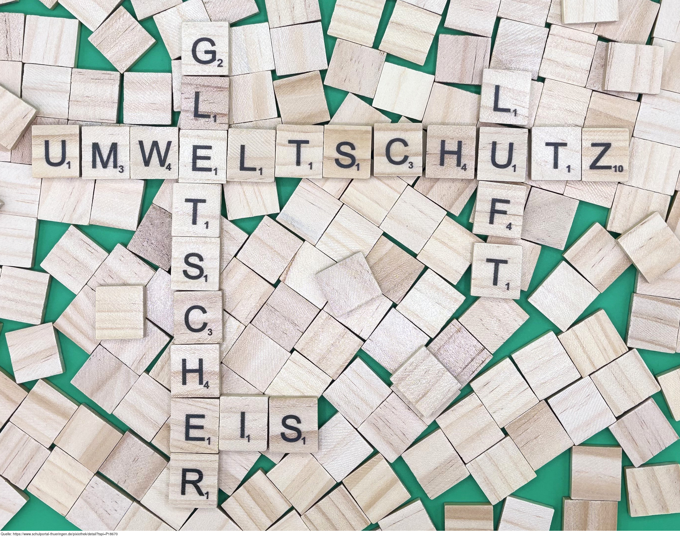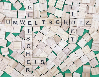 Aus Buchstaben wurden die Begriffe "Umweltschutz", "Gletscher", "Eis" und "Luft" gelegt. Es gelten die Nutzungsbedingungen der Mediothek und Pixiothek.
