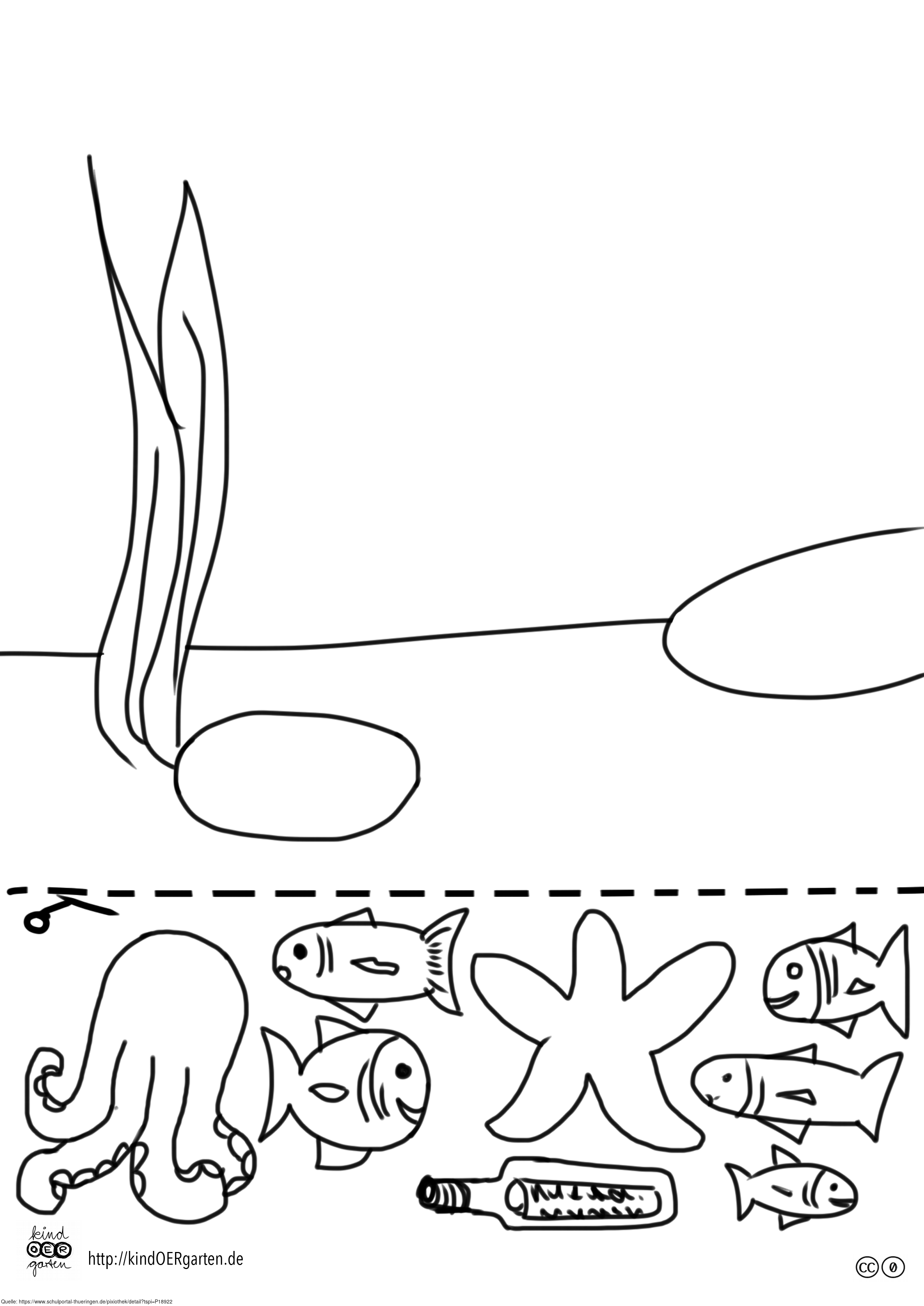 Das Bild zeigt das Motiv einer Unterwasserwelt (s/w) und kann als Schnipselbildvorlage für Kinder im Kindergarten bzw. Elementarbereich dienen. Das Bild ist unter CC0 lizenziert und kann somit frei verwendet werden. Es ist neben weiteren Bildern auch hier zu finden: https://kindoergarten.wordpress.com/