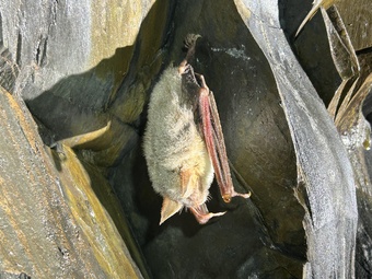 Das Bild zeigt ein Großes Mausohr (Fledermausart) in einem Schieferstollen. Es gelten die Nutzungsbedingungen der Mediothek und Pixiothek.
